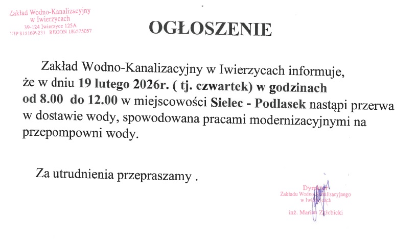 19.02.2026 r. przerwa w dostawie wody Sielec Podlasek