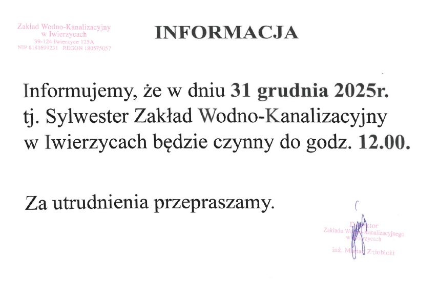 W dniu 31 grudnia 2025 r. zakład będzie czynny do godz. 12.00.