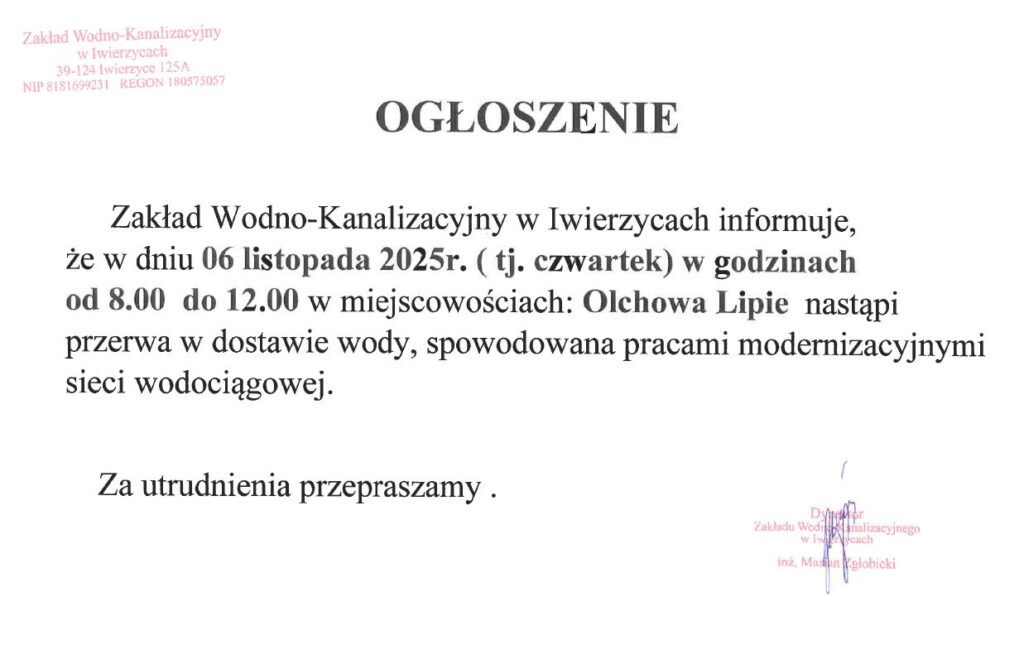 06.11.2025 r. przerwa w dostawie wody Olchowa Lipie